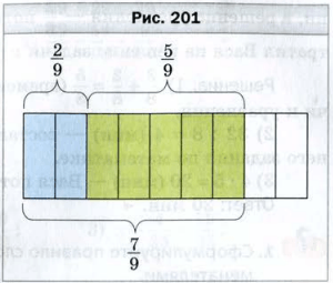 На рисунке 201 прямоугольника разделен на 9 равных частей. Сначала закрасили 2 части, а потом еще 5 частей. Таким образом, закрашенными оказались $\frac{7}{9}$ прямоугольника. Тогда можно сделать вывод, что: