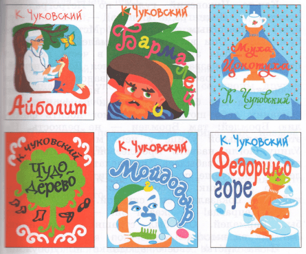 Названия книг К. И. Чуковского: • "Айболит". • "Бармалей". • "Муха−цококуха". • "Чудо−дерево". • "Мойдодыр". • "Федорино горе".