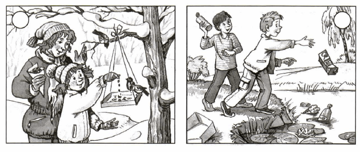 На каком рисунке показано хорошее отношение людей к природе? Закрась кружок.