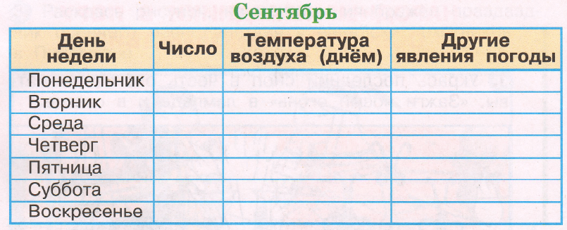 Понаблюдайте за погодой осенью. Каждый месяц ведите наблюдения в течение одной недели (примерно в середине месяца). Результаты заносите в таблицы, пользуясь условными знаками.