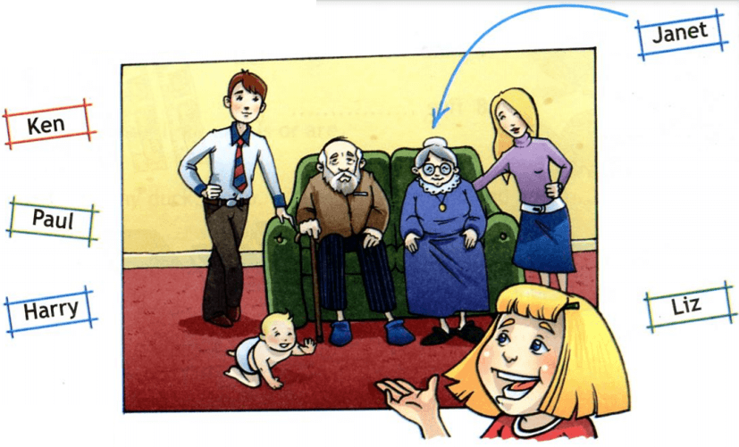 Hi! My name is Tina. This is a picture of my family. Can you see my grandma? Her name is Janet. My grandpa’s name is Ken. Can you see my mum and dad? My mum’s name is Liz. My dad’s name is Paul. And that’s my little brother Harry. Isn’t he cute?
