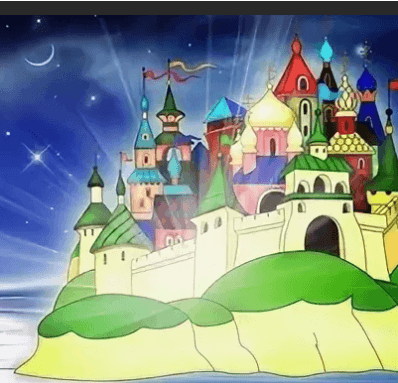 Я представляю себе остров Буян в море. На острове стоит город, окруженный кирпичной стеной. На входе со стороны моря расположилась охрана. В самом городе построены златоглавые церкви и белокаменные дома−терема, красивые сады и дворец.