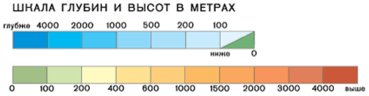 С помощью шкалы высоты и глубин по физической карте полушарий можно определить глубины океанов.