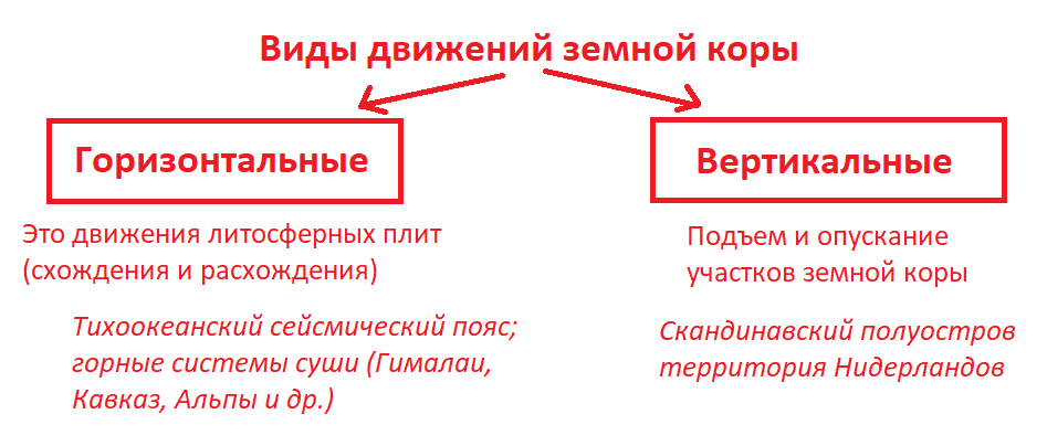 Составьте схему «Виды движений земной коры». Приведите примеры территорий Земли, где происходят разные виды движений земной коры.