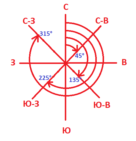 Определите, чему равен азимут: а) на северо‑восток; б) на северо‑запад; в) на юго‑запад; г) на юго‑восток.