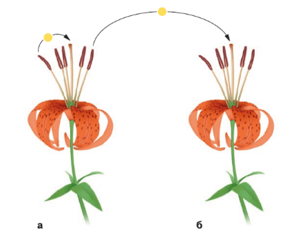 Рис. 99. Схема самоопыления (а) и перекрёстного опыления (б)