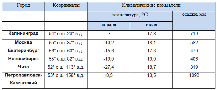 Вывод: при анализе данных таблицы, видим, что в городах, расположенных ближе к морю или океану, зима мягкое и теплое, лето прохладное, количество осадков значительное. А вот в других городах, при продвижении вглубь материка, с запада на восток увеличиваются амплитуды температур и снижается количество осадков.