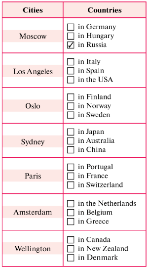 Возьмите интервью у своих одноклассников. Где следующие города? Поставьте галочку в правильном поле.