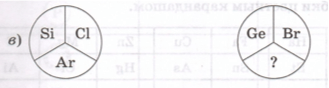 Ответ. Химические элементы по часовой стрелке расположены в порядке увеличения относительной атомной массы и находятся в одном периоде. Следовательно, во втором круге вместо вопросительного знака нужно вставить символ элемента криптон − Kr.